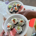 enough! Raina and Gautam have created an amazing class where they not only teach you how to make two vegetarian rolls, but also teach you some of the interesting history of sushi. They also make their own nori sauce, special cocktail, and chai teal for sale, and they were